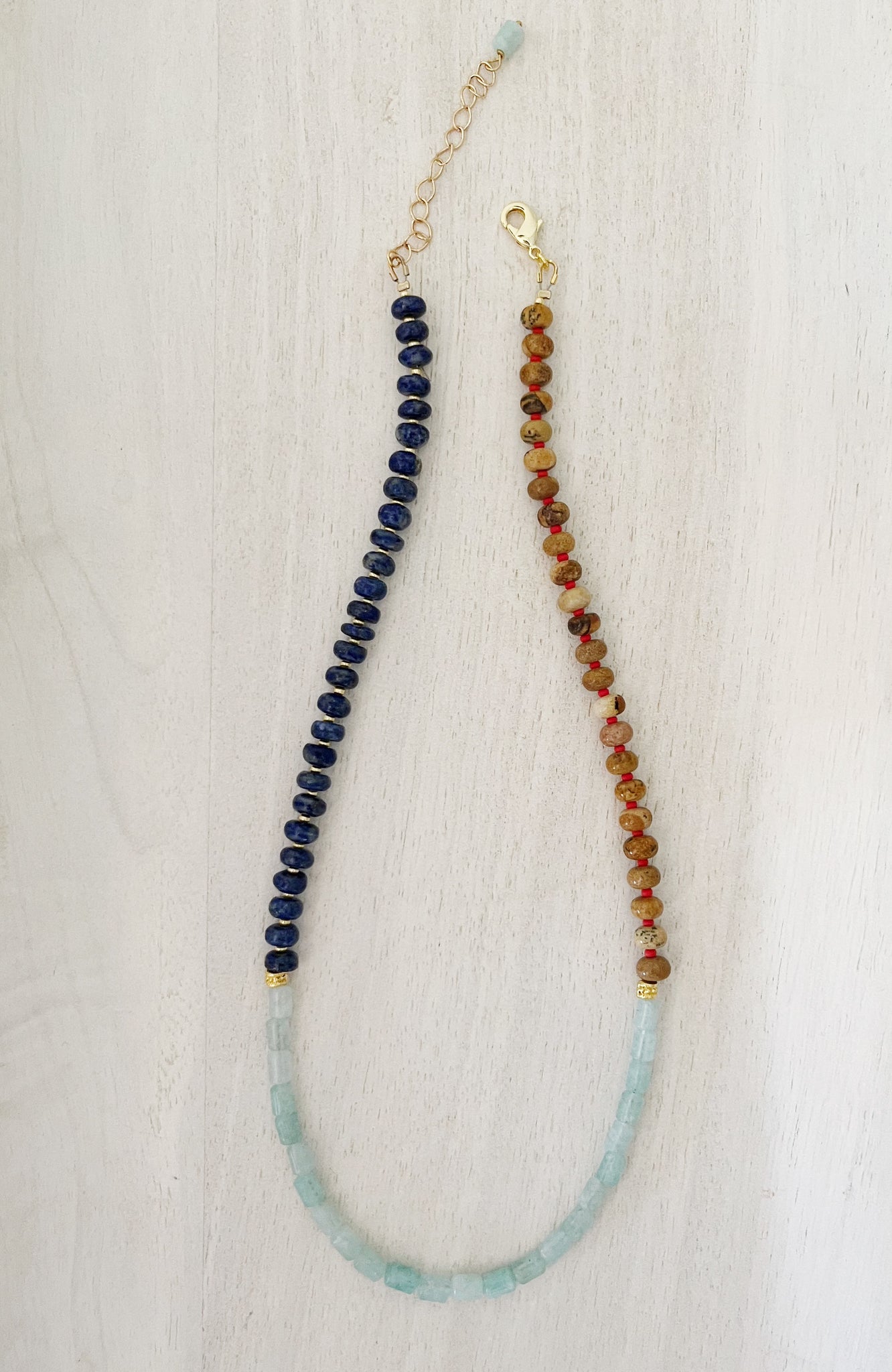 Honey + Ice is a one-of-a-kind design to transition your wardrobe effortlessly between the seasons. Created with warm jasper, blue lapis and soft jade, the colors blend beautifully to carry you from morning coffee to a casual night out. This necklace design is for those who like to keep it simple while still accessorizing and expressing your own style.