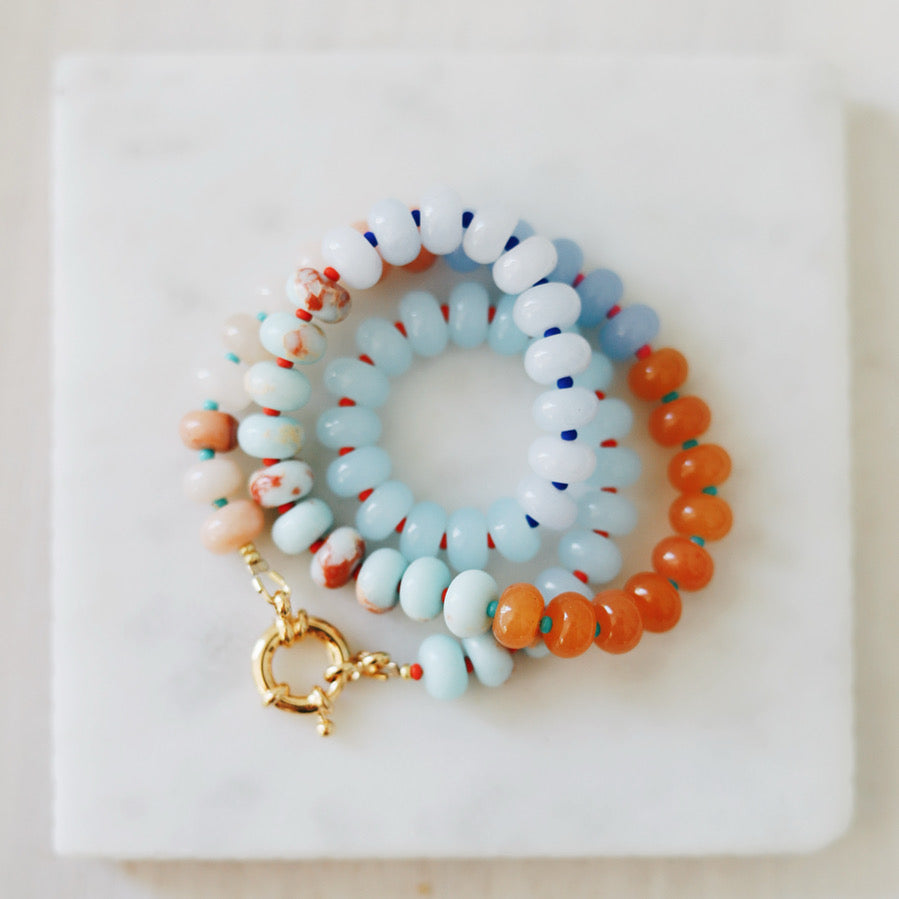 Each 8mm rondelle bead is carefully threaded onto a sturdy nylon chord with an easy clasp that can be worn facing front or back. Make it your own unique look by placing charms and pendants on the clasp.