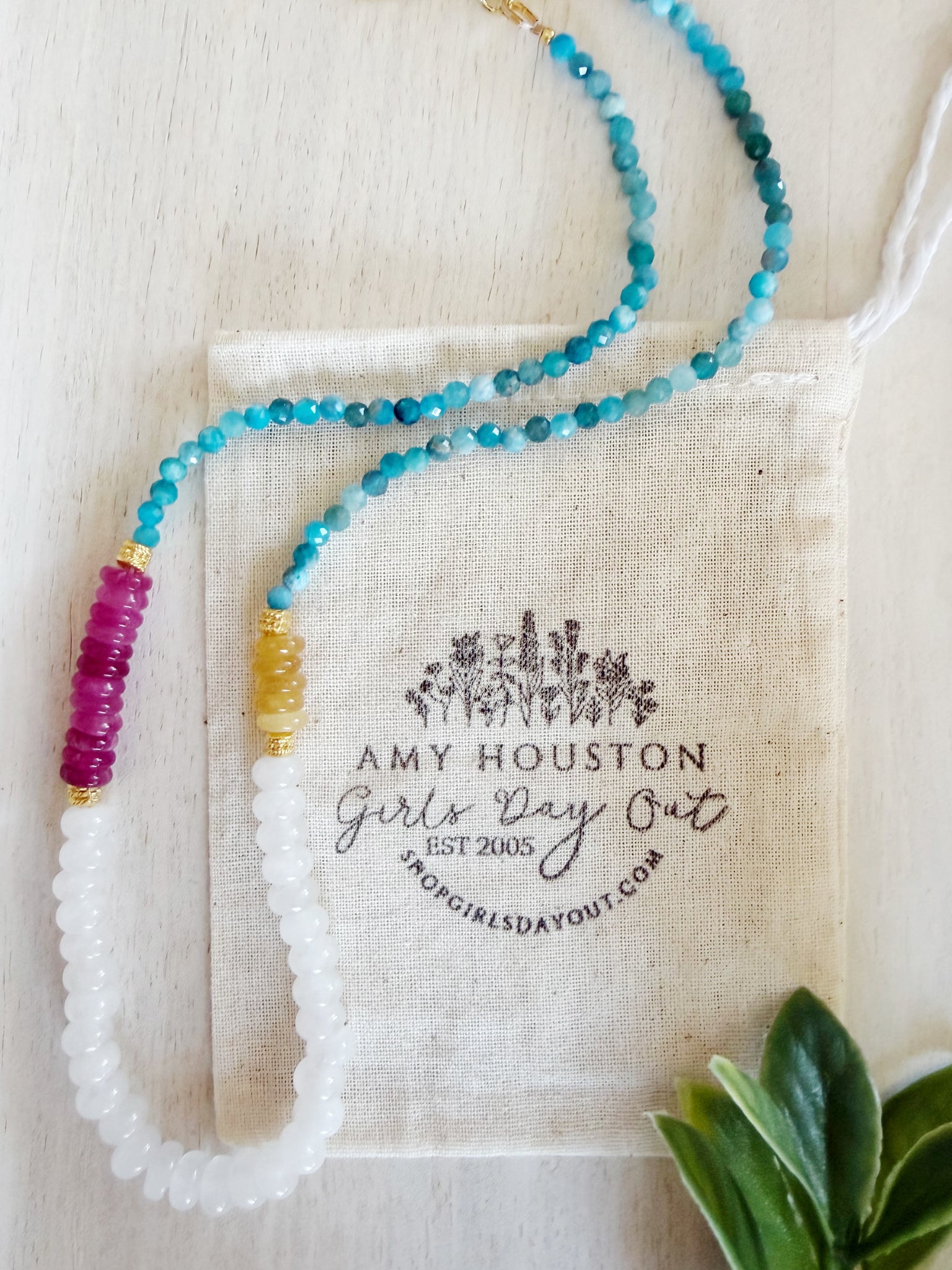 Meet the Sugarplum Necklace - a sweet mix of jade and tourmaline gemstones kissed with golden accents. It's a playful blend, capturing the magic of the season.