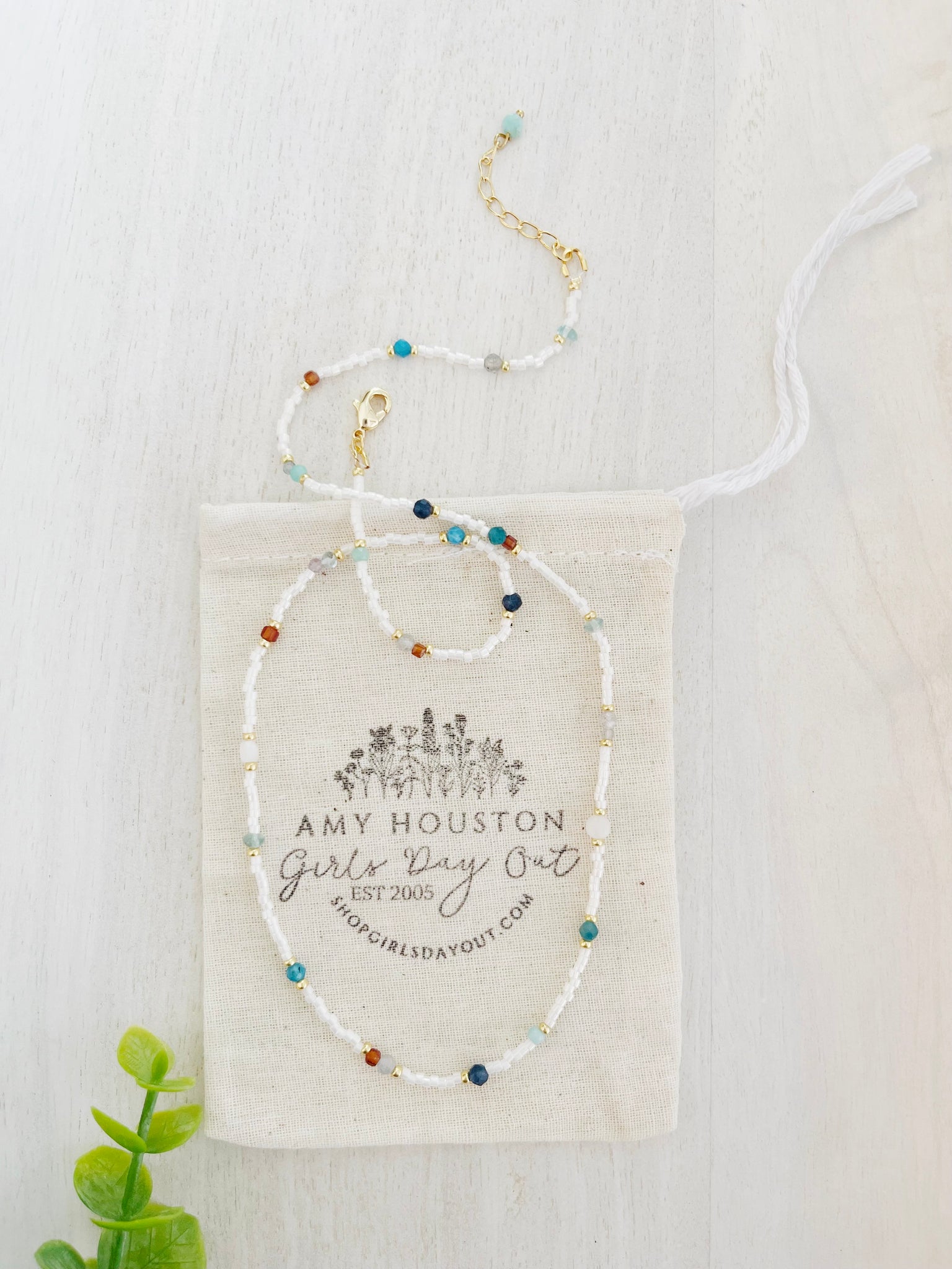 The Sunday Stroll necklace is created with a mix of japanese glass, and tiny faceted gemstones - including moonstone, labradorite, chalcedony, turquiose, pearl and lapis.