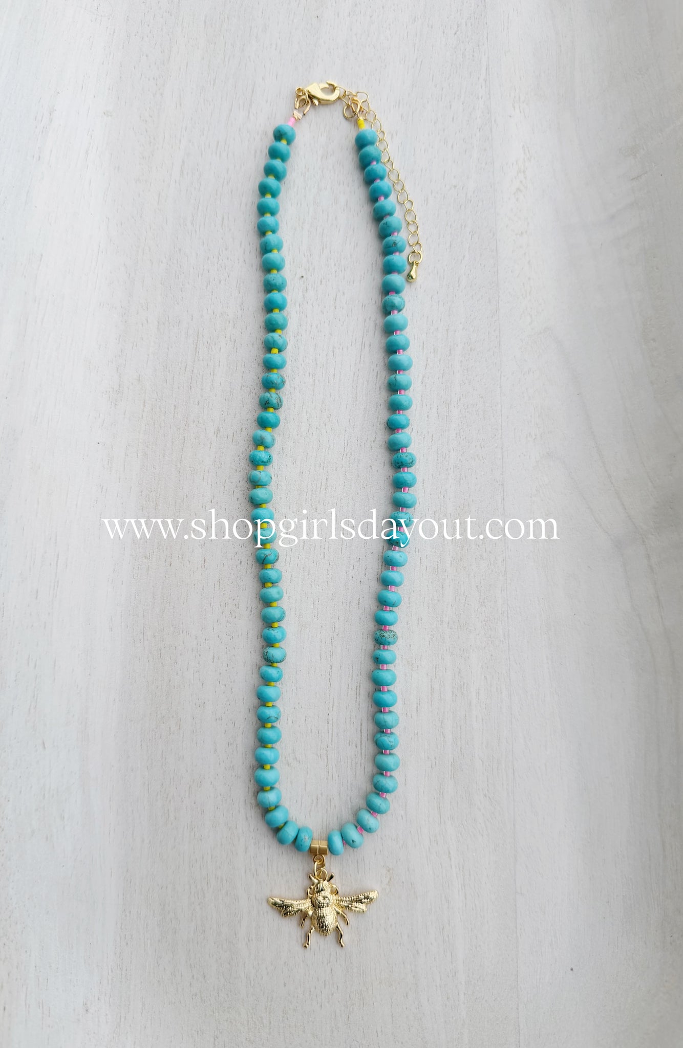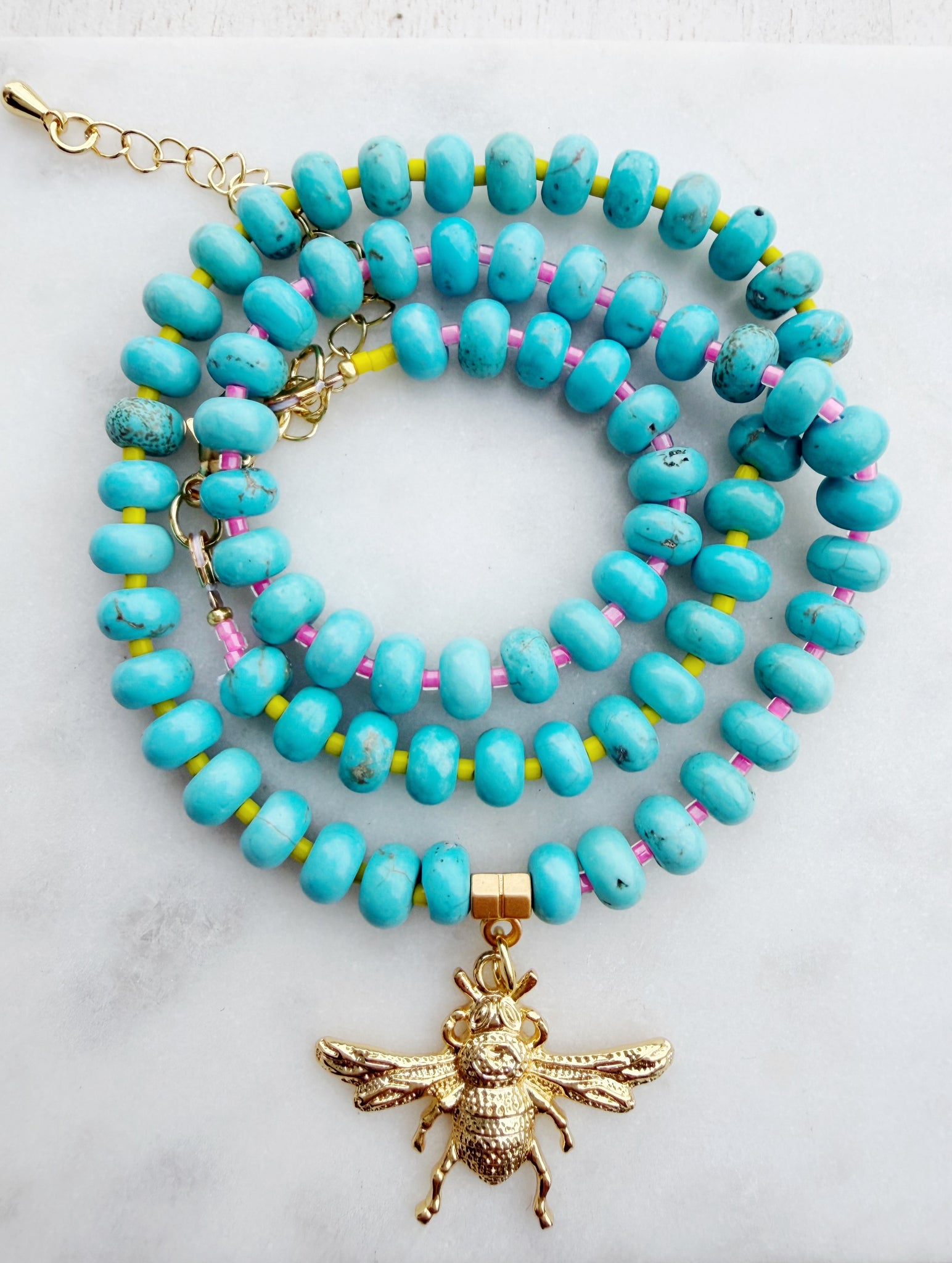 Add a pop of color and a touch of nature to any outfit with the Vivian Bee Necklace. Featuring a striking howlite turquoise stone paired with fluorescent pink and yellow accents, this one-of-a-kind piece is centered around a charming bee motif. Finished with a lobster clasp and an adjustable 2" chain, it’s perfect for layering or wearing solo. Earthy, playful, and full of life — a little piece of sunshine you can wear.